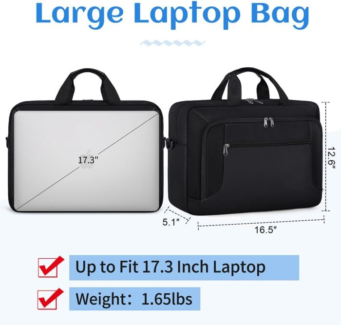 - Large Capacity & Multiple Pockets: Dimension of large laptop bag: 16.5*12.6*5.1, weight: 1.65 lbs. 3 main compartments to meet all your needs well. The main tech compartment can fit 17 inch laptop (up to 17.3 inch) and 12.9 inch iPad. 1 Front large easy access pocket with 4 slots for magazines, textbooks, paper, kindle, wireless mouse, pens, passport, wallet, etc. 1 Front small pocket keep your small items like keys, change purse, tissue, etc.
